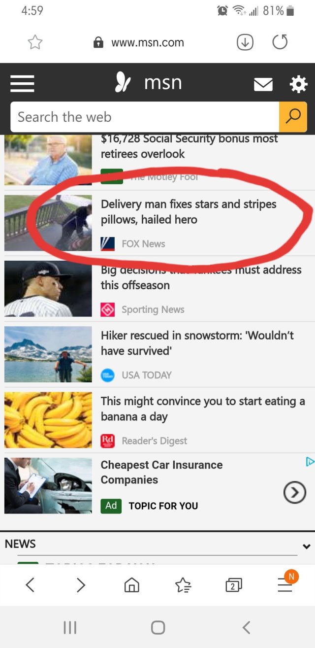 And if rearranging the pillows into the correct order makes one a hero, doesn’t that mean the homeowner–who I am going to go out on a limb and assume is responsible for her household decorations–is the villain in this story? She left her flag pillows out of order! That’s unpatriotic in comparison to the delivery man’s patriotic deed!